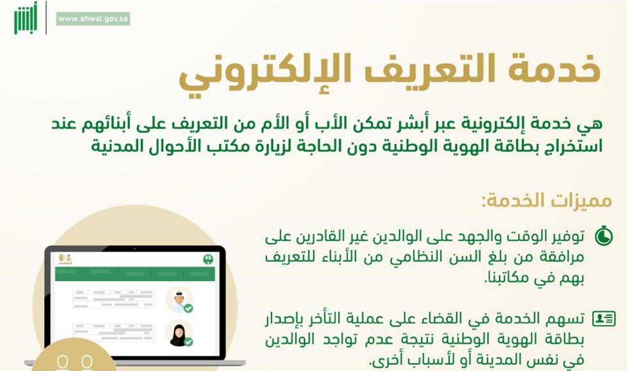 يستطيع أحد الوالدين إصدار تعريف إلكتروني لأحد الأبناء عبر منصة أبشر، وذلك من خلال اتباع التعليمات التالية: