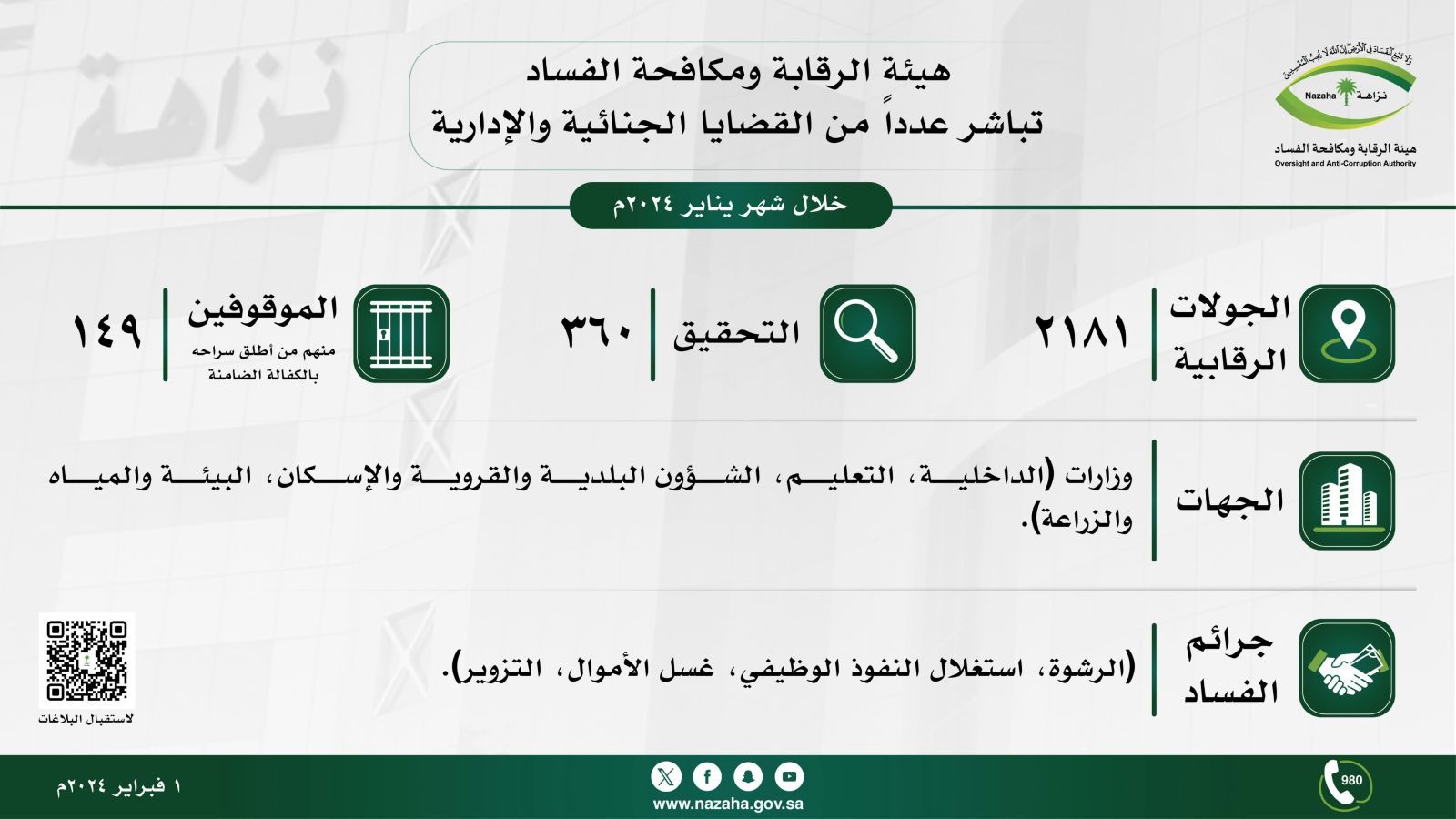 أعلنت هيئة الرقابة ومكافحة الفساد "نزاهة" أنها قامت، خلال شهر يناير 2024م، بتنفيذ 2181 جولة رقابية وقامت بالتحقيق مع 360 شخص مشتبه بهم.