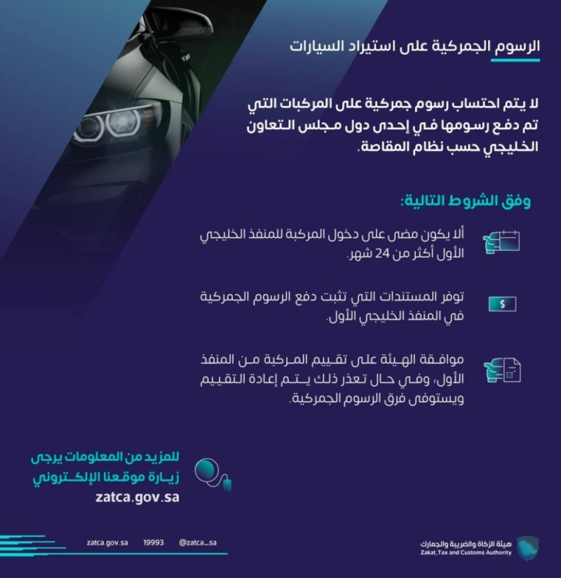 أوضحت الهيئة أنه لن يتم احتساب رسوم جمركية على المركبات التي تم دفع رسومها في أحد دول مجلس التعاون الخليجي، وفقًا لنظام المقاصة.