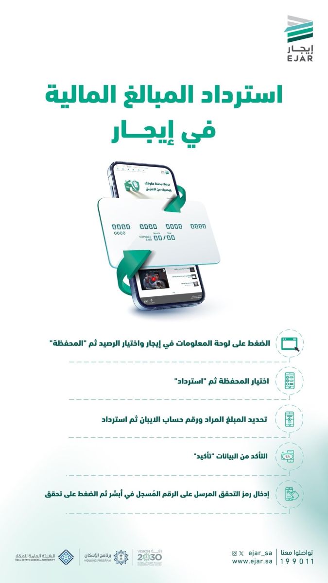 كما تقدم منصة إيجار خطوات واضحة ومفصلة لاسترداد المبالغ المالية في عمليات الإيجار، مما يجعل الخدمة سهلة وميسرة للمستخدمين، ويمكن إلغاء عقود الإيجار الإلكترونية بموافقة مشتركة قبل نهاية فترة العقد، حيث تقدم المنصة الإرشادات اللازمة لإتمام هذه العملية بسهولة ويسر.