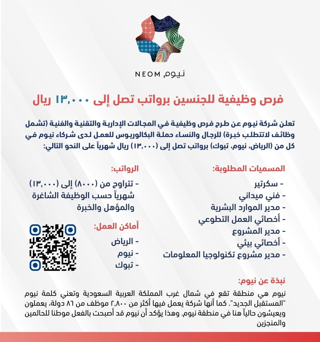 شركة نيوم تعلن عن فرص وظيفية مثيرة في مجالات متنوعة تشمل الإدارة والتكنولوجيا والفنون. تتوفر هذه الوظائف لحملة البكالوريوس، حتى لمن ليس لديهم خبرة سابقة.