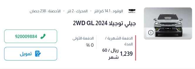 وفي إطار العروض ذاتها، يتوفر أيضاً موديل "جيلي توجيلا 2024 2WD GL" بنظام تقسيط يبدأ من 1,239 ريال سعودي شهرياً.