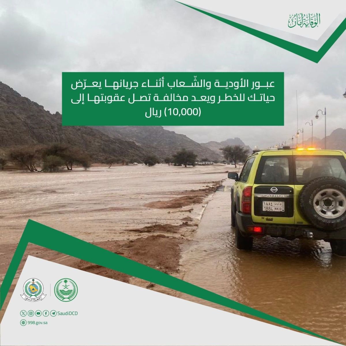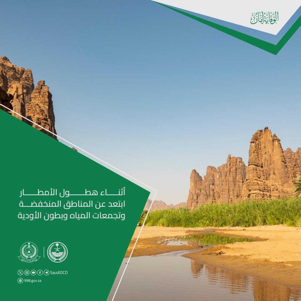 في تغريدة عبر حسابها في منصة "إكس"، أكدت المديرية على خطورة عبور الأودية والشعاب أثناء جريانها، حيث تعتبر هذه الفعلية مخالفة قد تُعاقب بغرامة تصل إلى 10,000 ريال سعودي، وتحث المديرية العامة للدفاع المدني على أهمية الحيطة والحذر خلال هذه الفترة الممطرة.