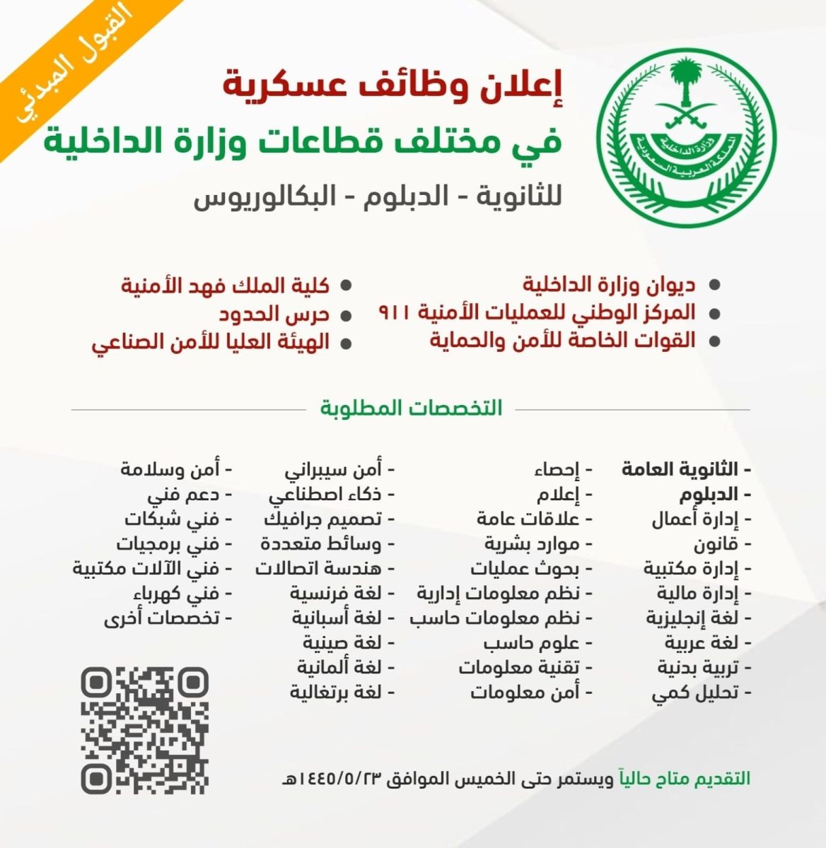 أعلنت الإدارة العامة للقبول المركزي بوكالة وزارة الداخلية للشؤون العسكرية عن نتائج القبول المبدئي للعمل في قطاعات وزارة الداخلية.