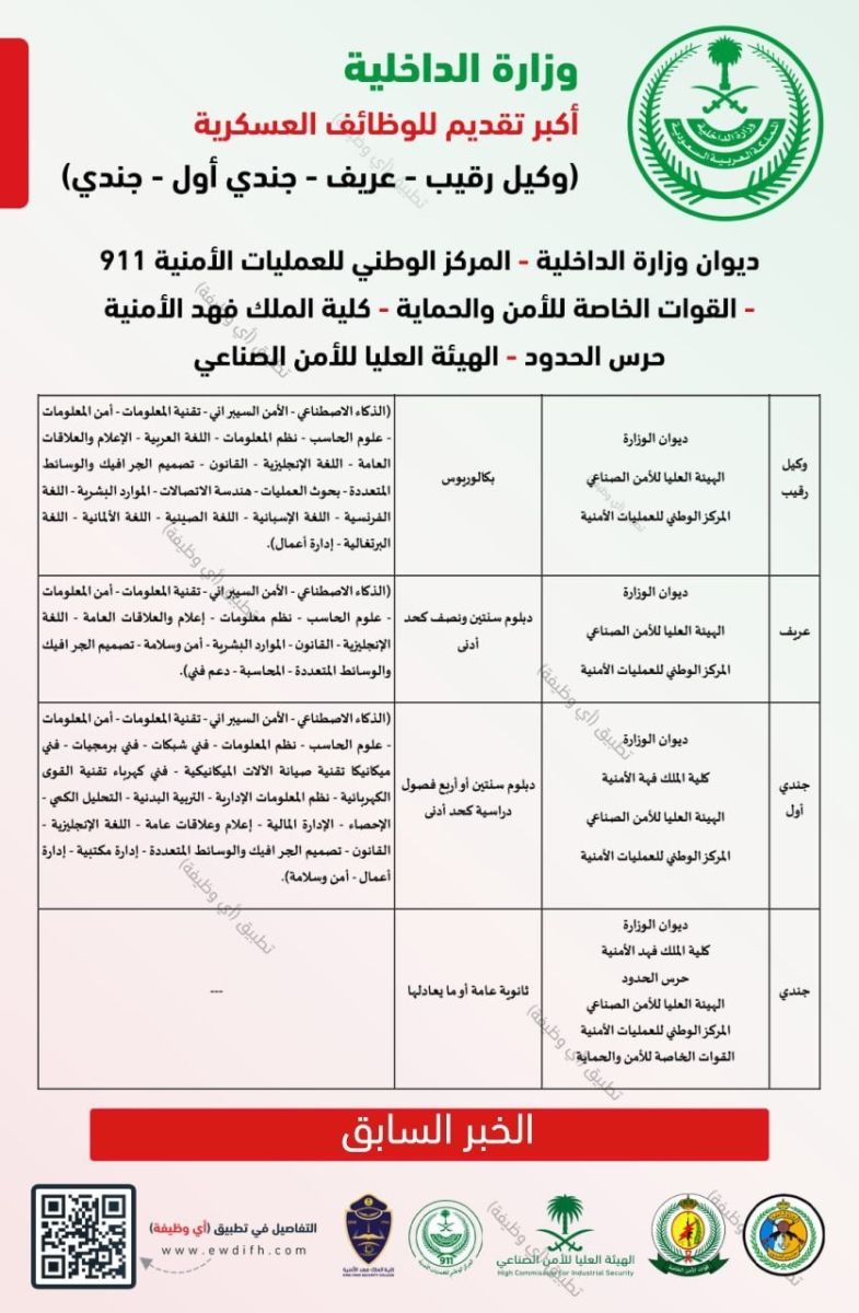 الرتب المتاحة تشمل عريف، وجندي، ووكيل رقيب، وجندي أول. لمعرفة نتيجة القبول المبدئي والبدء في إجراءات القبول، يمكن الدخول على منصة "أبشر – توظيف" من خلال الرابط المرفق في الإعلان.