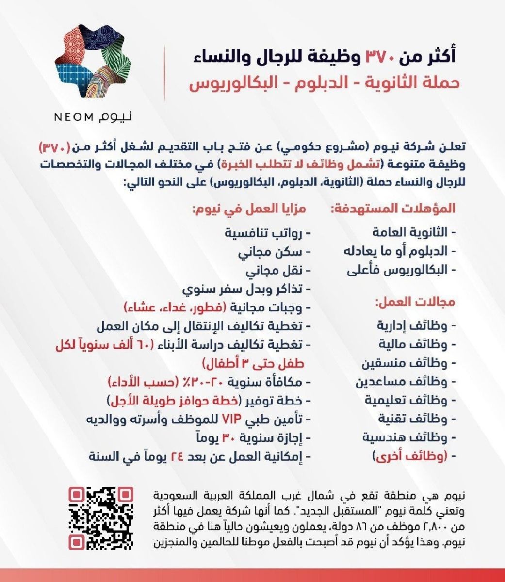 وظائف شاغرة في نيوم بسكن وبدلات وتأمين