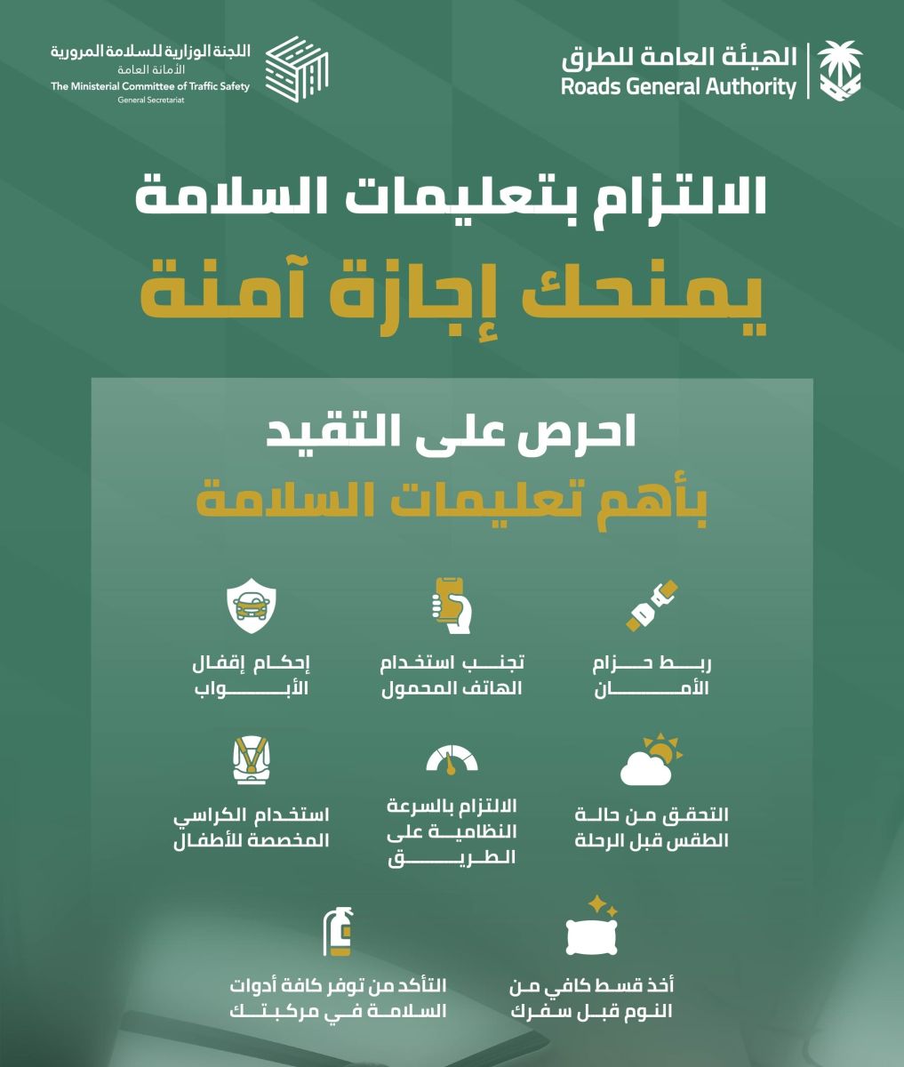 ألحت الهيئة على ضرورة اتباع إرشادات الأمان، خصوصًا مع قدوم فترة الإجازات، مشددة على النقاط التالية: