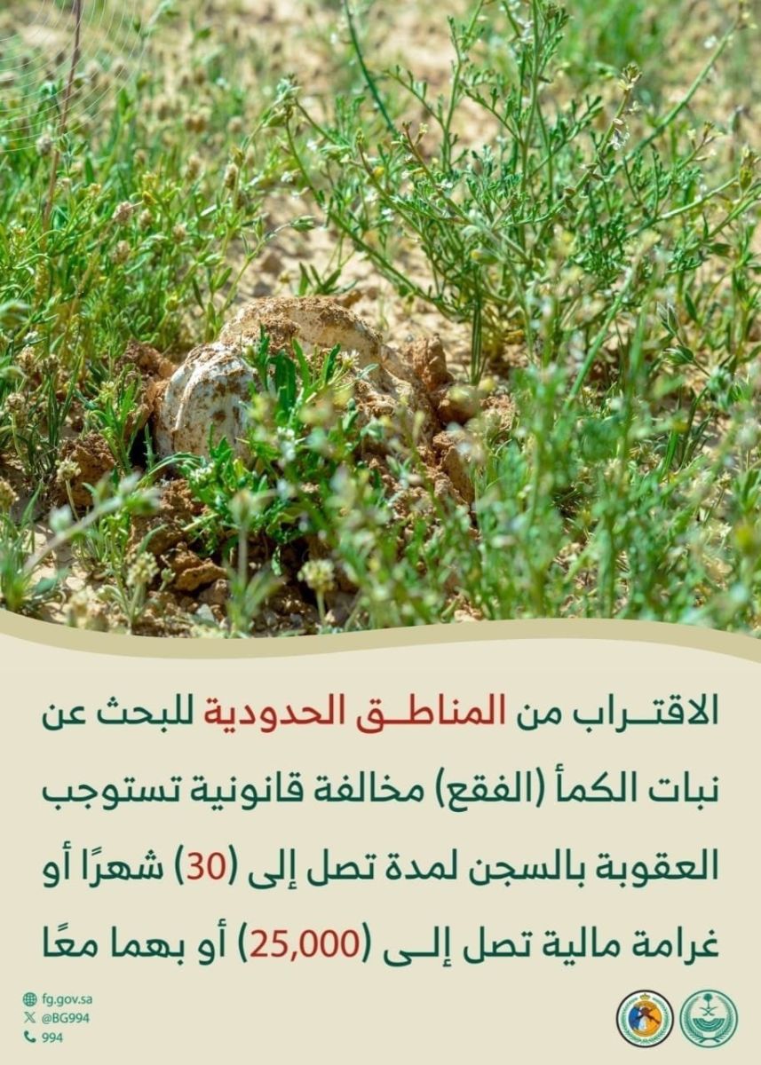 التحذير يشير إلى أن الاقتراب من المناطق الحدودية بهدف البحث عن هذا النبات قد يؤدي إلى عقوبة السجن لمدة تصل إلى 30 شهرًا، أو غرامة مالية تصل إلى 25,000 ريال، أو كلتا العقوبتين معًا. وهذه العقوبات موجودة ضمن نظام أمن الحدود ولائحته التنفيذية.