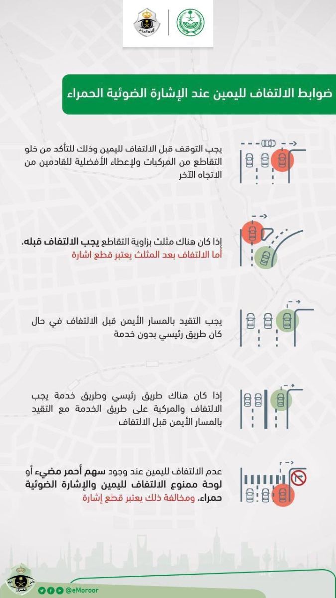 وفي تفاصيل أكثر، تطرقت الإدارة إلى الضوابط المحددة للالتفاف إلى اليمين عند الإشارات الحمراء إذا كان المسار مخصصًا لذلك.