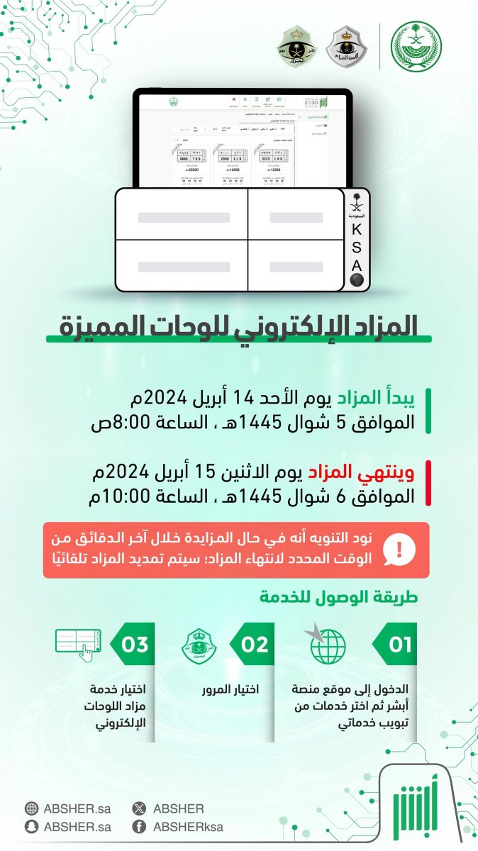 ذكرت الإدارة في تغريدة على منصة إكس أن المزاد سينطلق في الرابع عشر من إبريل ويستمر ليوم واحد فقط، حتى الخامس عشر من إبريل، عبر منصة أبشر.