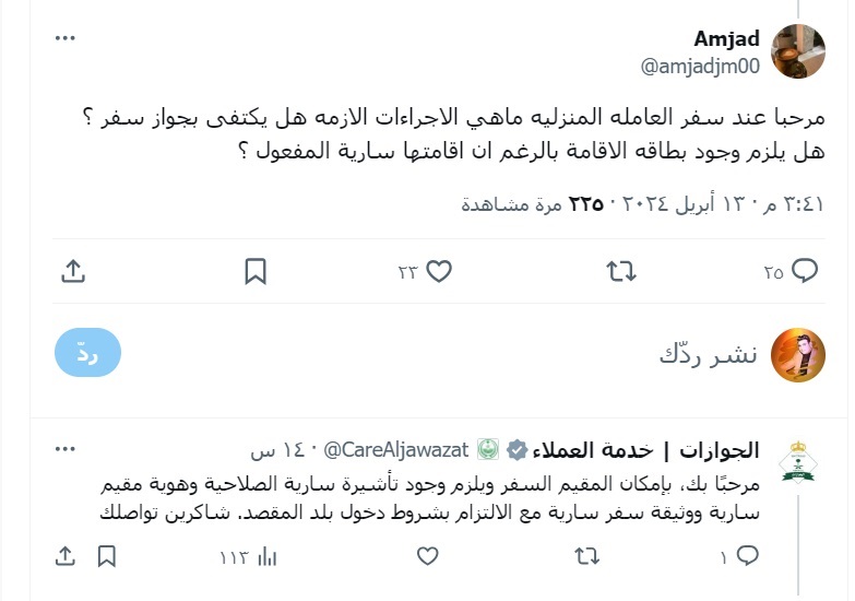 هذا جاء رد على استفسار أحد المستفيدين حول متطلبات سفر العاملة المنزلية وما إذا كان جواز السفر يكفي أو يلزم وجود بطاقة الإقامة على الرغم من صلاحيتها.