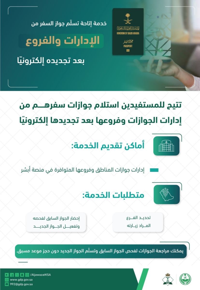 أضافت "الجوازات" أنها قد وفرت خدمة استلام وتفعيل جوازات السفر للمواطنين بعد تجديدها إلكترونياً، وذلك بزيارة أحد فروعها أو عبر المنافذ الدولية عند السفر، مع ضرورة إحضار الجواز القديم للفحص.