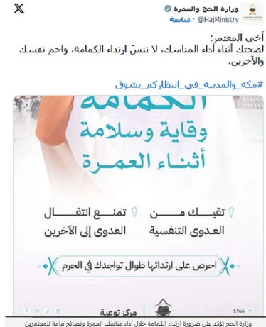 الوزارة حثت جميع العاملين في قطاع الحج والعمرة على توعية المعتمرين بأهمية هذه الإجراءات، وتوفير كافة المستلزمات اللازمة لضمان تطبيقها بشكل فعال.