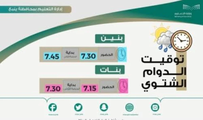 حرصت وزارة التعليم على تهيئة اليوم الدراسي بشكل يتناسب مع الأجواء الشتوية الباردة، حيث يتم تقليل عدد ساعات الدراسة يوميًا، تفاصيل نظام الحصص ستكون كما يلي: