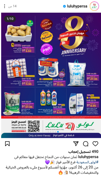 أعلنت سلسلة لولو هايبر ماركت في السعودية عبر حسابها الرسمي على إنستجرام عن أحدث عروضها بمناسبة الذكرى السنوية لافتتاح فرع الأمير فواز.