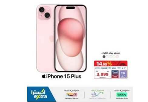 - آيفون 15 برو، بحجم شاشة 6.1 بوصة وسعة 128 جيجا، بسعر 3899 ريال سعودي بعد خصم 800 ريال.