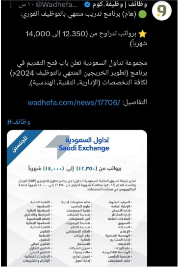 يوفر برنامج تداول السعودية فرصة ذهبية للخريجين والخريجات للالتحاق ببرنامج يجمع بين التدريب العملي المكثف وفرصة العمل في واحدة من أبرز المؤسسات في المملكة، إلى جانب الرواتب المجزية، يمثل البرنامج بوابة نحو بناء مسار وظيفي مستدام قائم على التطور المهني والابتكار.