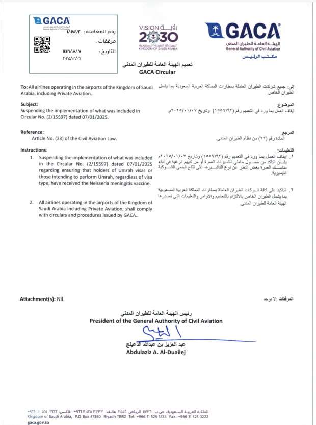 أوضح عبد العزيز بن عبد الله الدعيلج، رئيس الهيئة العامة للطيران المدني السعودي، في منشور رسمي أن إيقاف شرط الحصول على تطعيم الحمى الشوكية للراغبين في أداء مناسك العمرة أصبح ساريًا من اليوم، داعيًا جميع شركات الطيران إلى الالتزام التام بالتوجيهات الصادرة عن الهيئة وعدم مخالفتها.