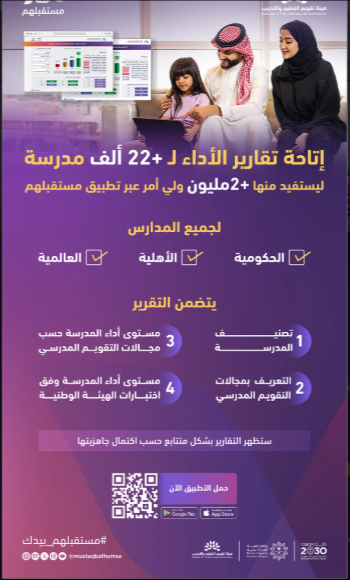 حيث تتيح التقارير المقدمة عبر تطبيق "مستقبلهم" لأولياء الأمور نظرة شاملة وواقعية عن أداء المدارس، من خلال بيانات دقيقة تشمل متوسط نتائج الطلاب في اختبارات "نافس" الوطنية، وبالإضافة إلى اختبارات القبول الجامعي مثل "القدرات العامة" و"التحصيلي".