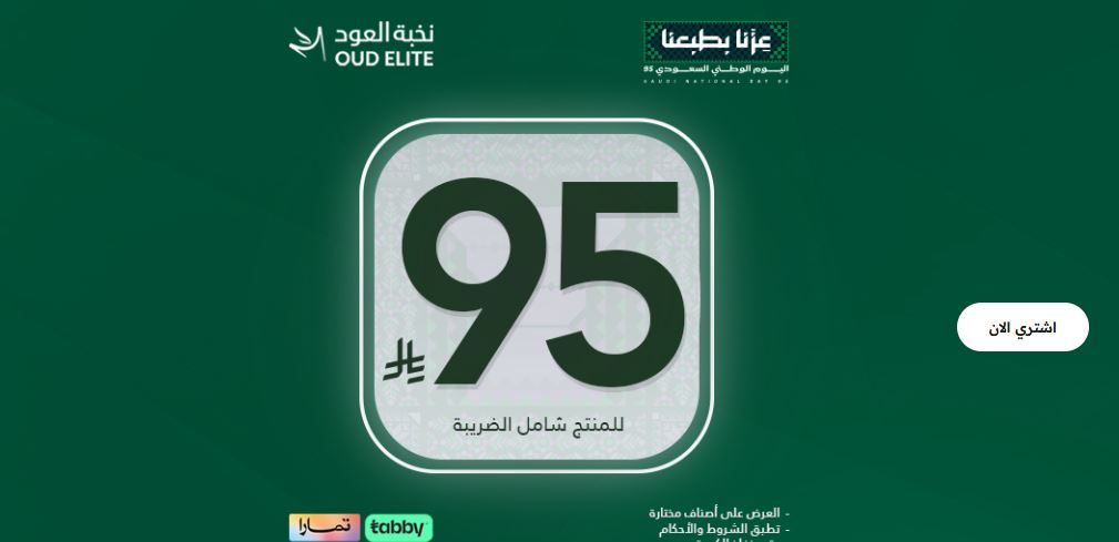 أعلنت شركة نخبة العود، المتخصصة في العطور والبخور الفاخر، عن إطلاق عروض خاصة بمناسبة اليوم الوطني السعودي الخامس والتسعين، حيث خصصت عرض مميز لعطر واحد أو أكثر بسعر ثابت قدره ٩٥ ريال فقط.