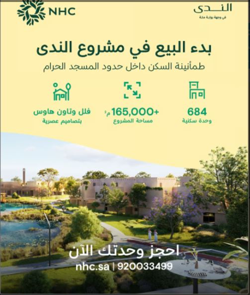 في خطوة نوعية تعكس مسيرة التطوير العمراني في مكة المكرمة، أعلنت الشركة الوطنية للإسكان (NHC) عن بدء البيع في مشروعها الجديد "الندى"، الذي يعد أحد المشاريع السكنية المميزة ضمن وجهة بوابة مكة العمرانية في العاصمة المقدسة.