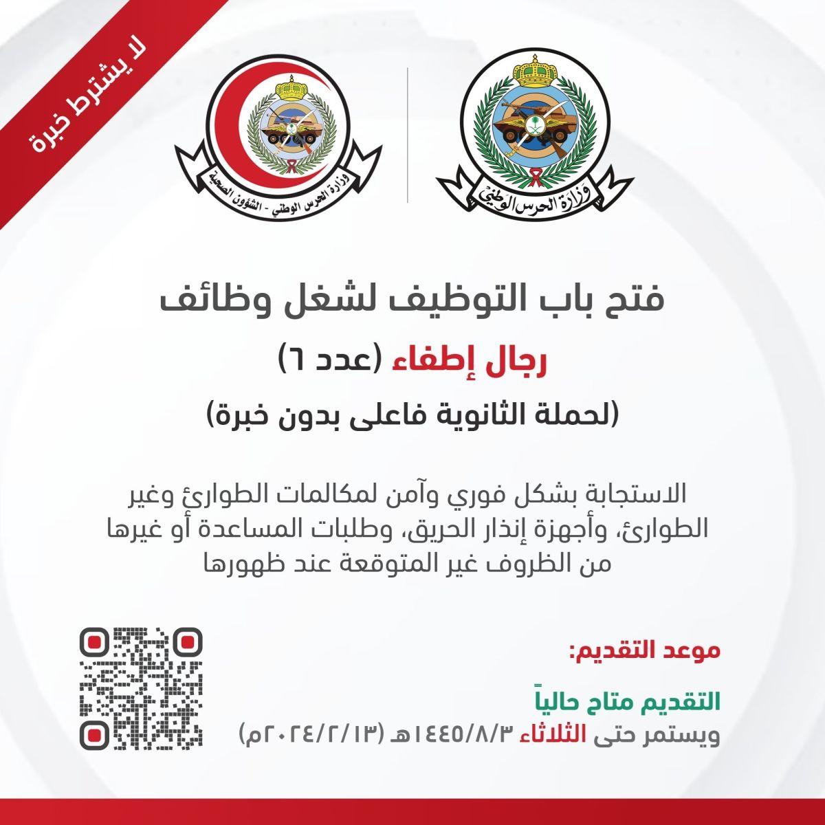 أعلنت وزارة الحرس الوطني، في إدارة الشؤون الصحية، عن توفر 6 فرص عمل شاغرة تحت مسمى "رجال الإطفاء".
