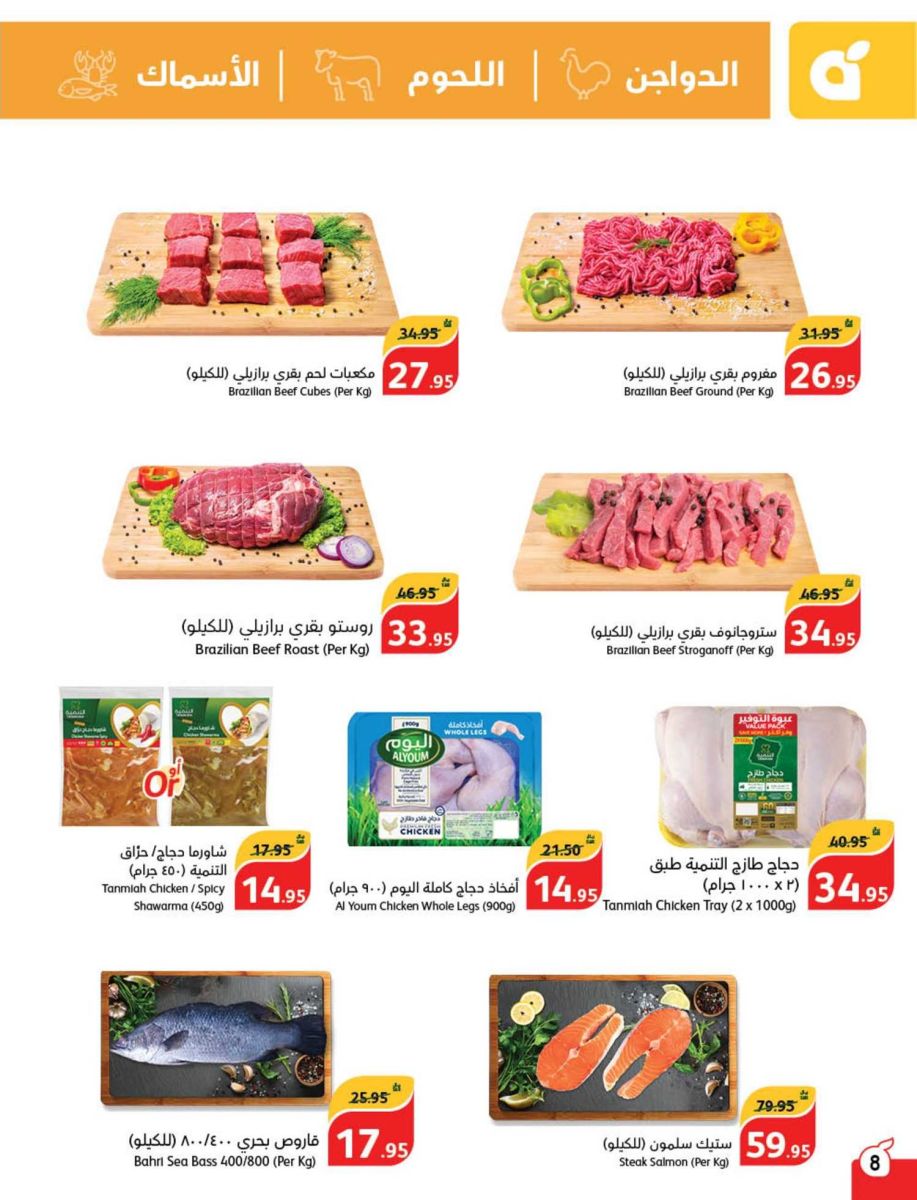 وفي قسم اللحوم والأسماك، يتوفر سمك القاروص البحري، والسلمون النرويجي، وطبق الدجاج الطازج، بالإضافة إلى خصومات على شاورما الدجاج الحراق والروستو البقري البرازيلي والستروجانوف البقري البرازيلي.