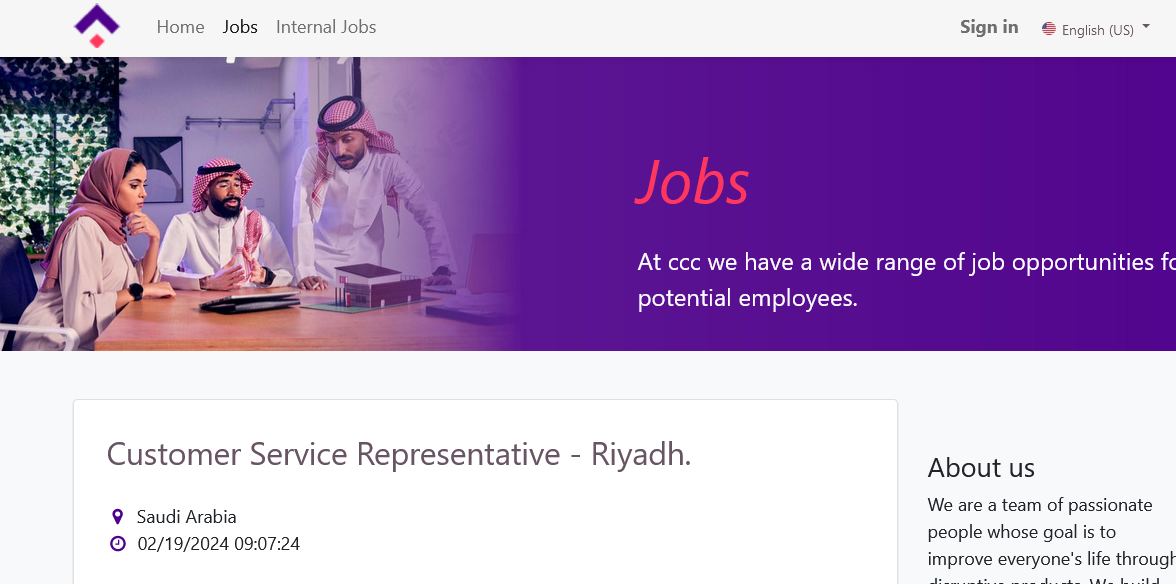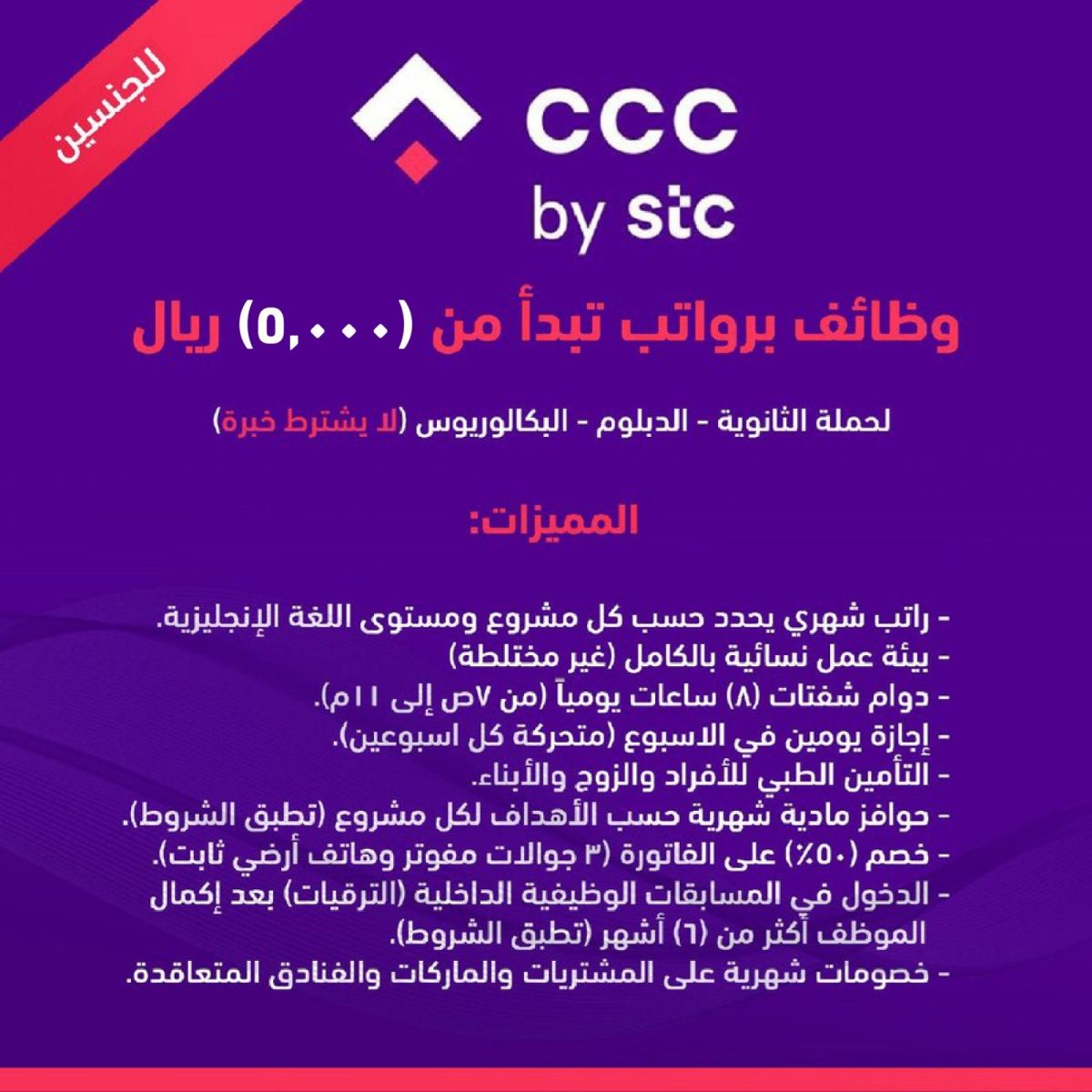 يمكن التقديم على الوظائف المتاحة عبر ملء النموذج على هذا الرابط هنا، تقدم شركة مراكز الاتصال CCC خدماتها كنتاج لشراكة استراتيجية بين شركة الاتصالات STC وشركة أيجز العالمية، والتي تختص في إدارة تجارب العملاء في 44 موقعًا حول العالم، وتخدم أكثر من 150 شركة في قطاعات مختلفة.
