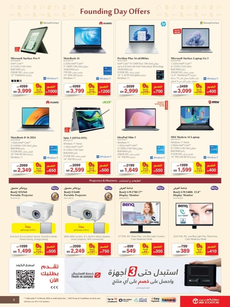 تستمر هذه العروض حتى يوم 3 مارس 2024، وتتيح مكتبة جرير أيضًا خيار التقسيط على مدى 12 شهرًا بدون فوائد لحاملي البطاقات الائتمانية من البنوك المشاركة بحد أدنى 1200 ريال سعودي.