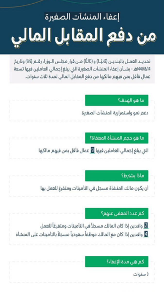 يأتي هذا القرار ليمتد لفترة محددة تطبق على المنشآت الصغيرة في المملكة العربية السعودية، وتم تحديد الحد الأقصى لعدد العمال المسموح به في هذه المنشآت لتشمل بنود تمديد المقابل المالي.
