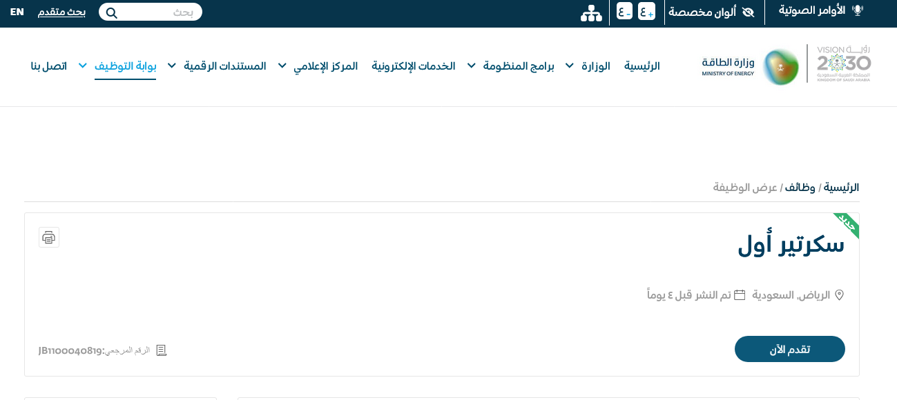 تعلن وزارة الطاقة عن توفر فرص وظيفية إدارية لمسمى "سكرتير أول" في مدينة الرياض، وذلك لحملة شهادة البكالوريوس في تخصصات مختلفة دون الحاجة لخبرة سابقة.