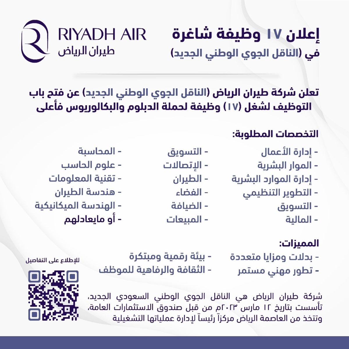 تم فتح باب التوظيف في شركة طيران الرياض (الناقل الجوي الوطني الجديد) لشغل 17 وظيفة لحملة الدبلوم والبكالوريوس فأعلى.