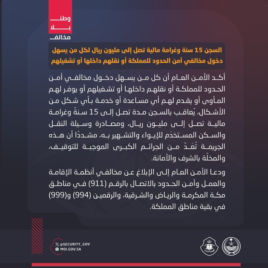 أكدت الجهات الأمنية أن أي فرد يسهل دخول مخالفين لأمن الحدود إلى المملكة، أو يقلل من مسافتهم داخلها، أو يشغلهم، أو يؤمن لهم مأوى، أو يقدم لهم أي نوع من الدعم أو الخدمة، سيعاقب بالسجن لمدة تصل إلى 15 عام، إضافة إلى غرامة مالية قد تبلغ مليون ريال.
