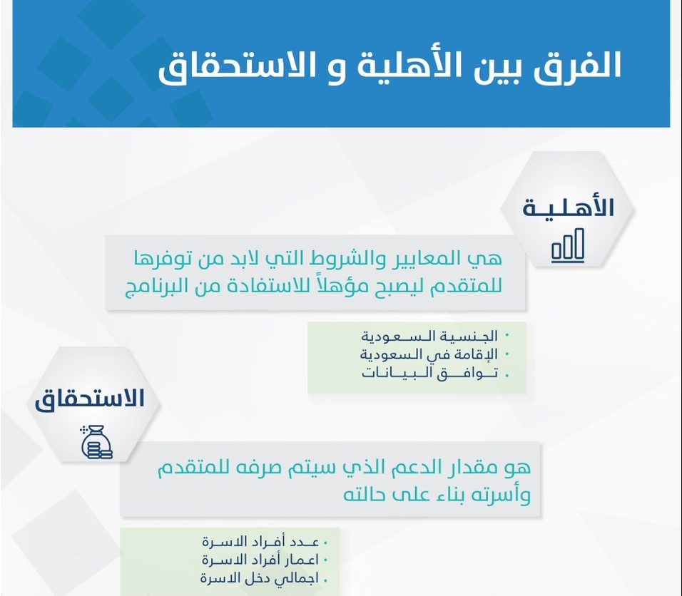 من المهم أن تفهم المتزوجة الفرق بين شروط الأهلية وشروط الاستحقاق، فالأولى تحدد ما إذا كان الفرد مؤهلاً للتسجيل في البرنامج بشكل عام، بينما تحدد الثانية قيمة الدعم النقدي الفعلية التي ستحصل عليها الأسرة بناءً على عوامل مثل الدخل الشهري وعدد أفراد الأسرة وأعمار التابعين.