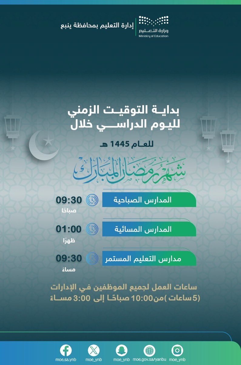 أعلنت إدارة التعليم في محافظة ينبع عن تحديد بداية اليوم الدراسي خلال شهر رمضان المبارك للمدارس التابعة للمحافظة والقطاعات المرتبطة بها للعام الدراسي 1445 هـ.