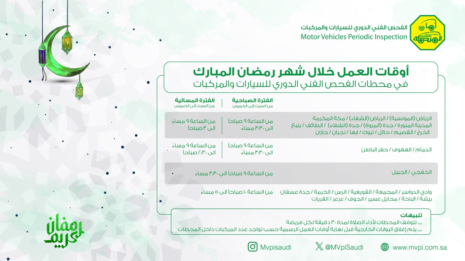 لأجل شهر رمضان المبارك للعام 1445هـ، ضبطت محطات الفحص الدوري للسيارات ساعات العمل لتنقسم إلى فترة صباحية وأخرى مسائية، مع الإشارة إلى أن بعض المحطات اختارت تخصيص فترة عمل صباحية فحسب.