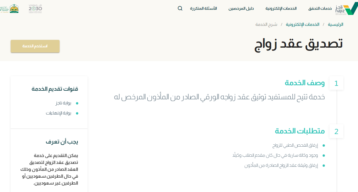 قامت وزارة العدل السعودية بتحديد متطلبات لاستخراج عقد الزواج بوساطة الإنترنت من خلال منصة ناجز، وتشمل هذه المتطلبات الآتي: