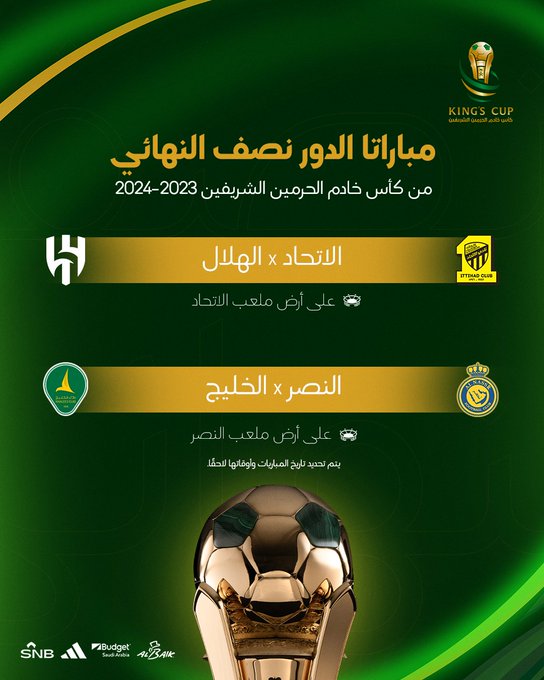 كشفت نتائج سحب قرعة الدور نصف النهائي لبطولة كأس خادم الحرمين الشريفين لعام 2024 عن المباريات التالية: ستقام مباراة بين الاتحاد والهلال في استاد الجوهرة المشعة في جدة، بينما تجمع المباراة الأخرى النصر والخليج في استاد الأول بارك بالعاصمة الرياض.