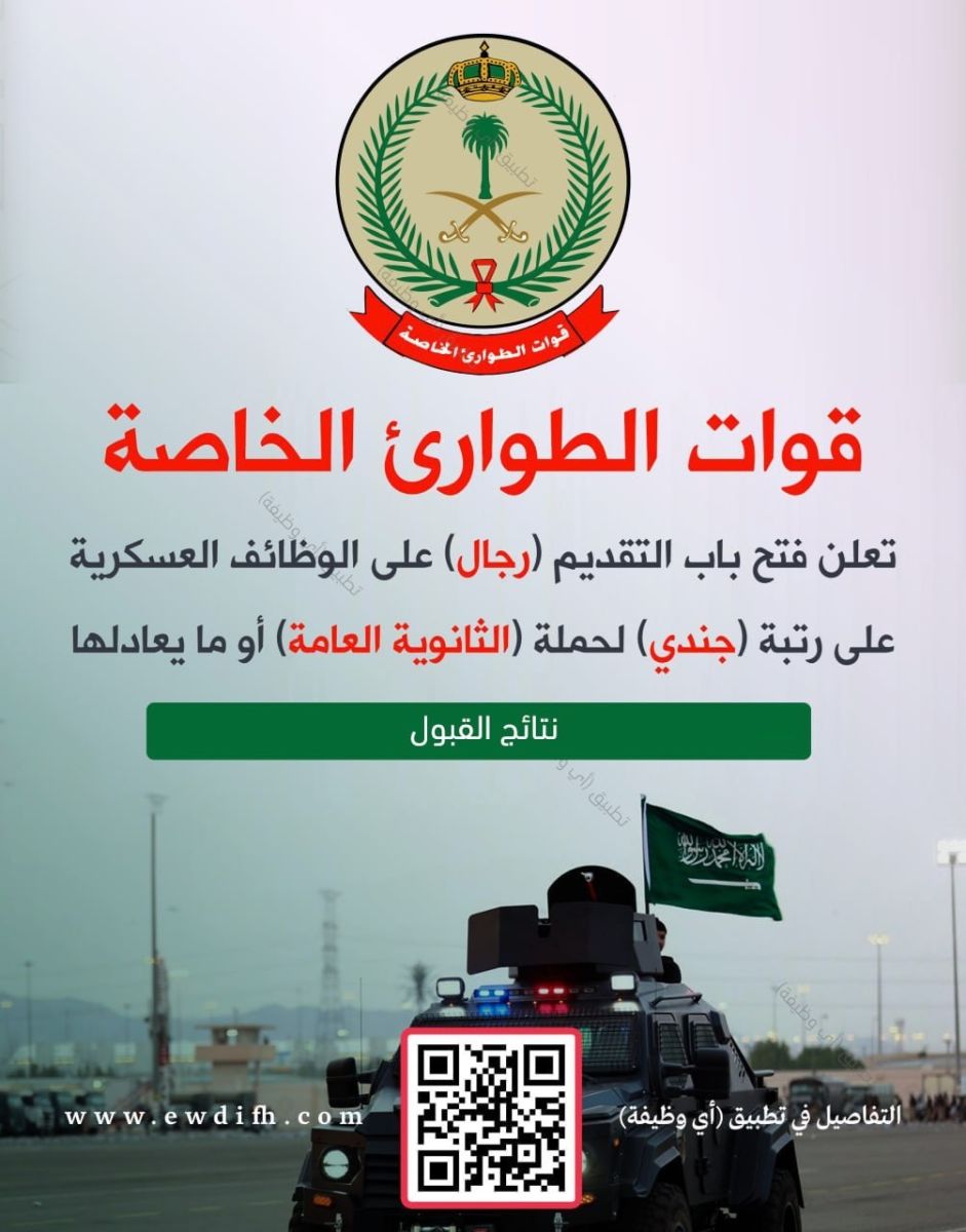 إعلان نتائج القبول للمناصب العسكرية بقوات الطوارئ الخاصة الدرجة العسكرية: رتبة جندي.