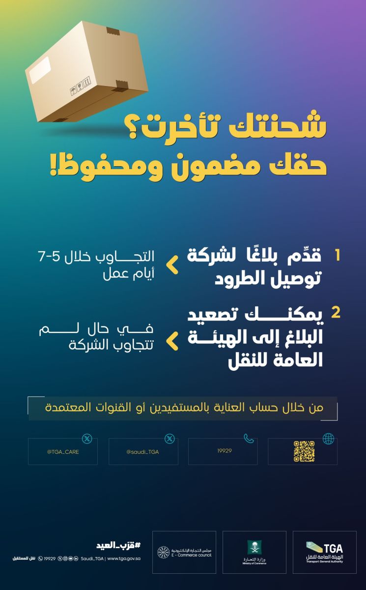 أعلنت الهيئة العامة للنقل عن إمكانية رفع شكوى رسمية من قبل المستخدمين في حال لم تستجب شركات البريد السريع لتظلماتهم خلال فترة تتراوح بين 5 إلى 7 أيام عمل، من خلال قنوات التواصل المصرح بها.