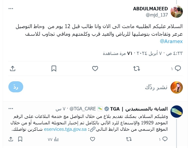 في هذا السياق، تفاعل حساب خدمة العملاء بمنصة إكس مع استفسار أحد الأشخاص قائلاً: "مضى أكثر من 12 يوم ولم تصل الطلبية بعد، وعلى الرغم من أن المفترض توصيلها إلى عرعر، إلا أنني فوجئت بوصولها إلى الرياض، ومع اقتراب العيد وتواصلي معهم، للأسف لم أجد استجابة".