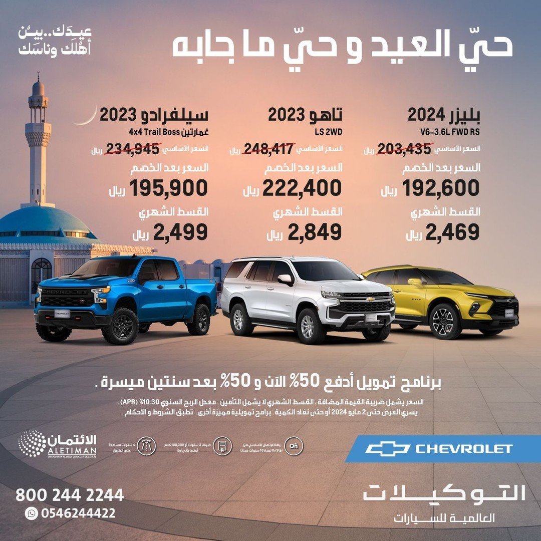 هذا العرض يأتي تحت شعار "حيّ العيد وحيّ ما جابه، عيدك.. بين أهلك وناسك"، وهو متاح لجميع عملاء شيفروليه في المملكة العربية السعودية بالتعاون مع دار الائتمان السعودي.