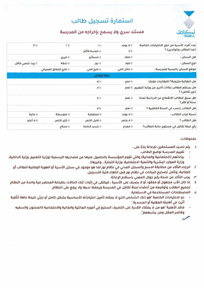 يجب ملء النموذج بكافة البيانات المطلوبة بدقة واهتمام. يتم هذا الإجراء عبر لجنة تكافل المدرسية التي تعمل على التحقق من استحقاق الطالب أو الطالبة للدعم المقدم.