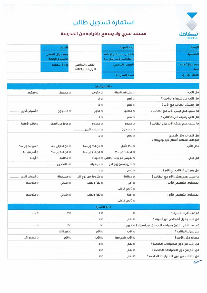 تعتبر هذه الاستمارة وثيقة سرية لا يسمح بأخذها خارج المدرسة، للحصول على استمارة تسجيل طالب في تكافل 1446، يمكن الرجوع إلى الروابط التالية: