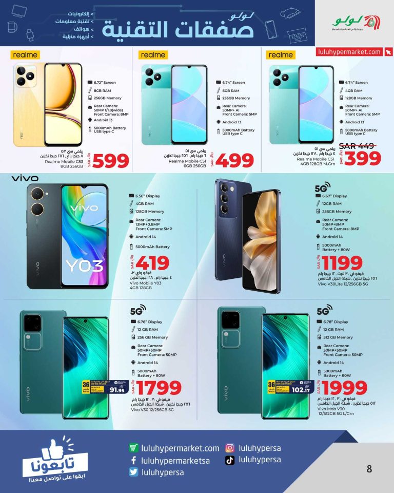 بالإضافة إلى فيفو V30 لايت المدعوم بالجيل الخامس، وتخفيضات على جوال فيفو Y3 بسعة 128 جيجابايت و4 جيجابايت رام، إلى جانب عرض مميز على جوال ريلمي C53 بسعة تخزين 256 جيجابايت و8 جيجابايت رام، وخصم على جوال ريلمي C51 بسعة 128 جيجابايت و4 جيجابايت رام.