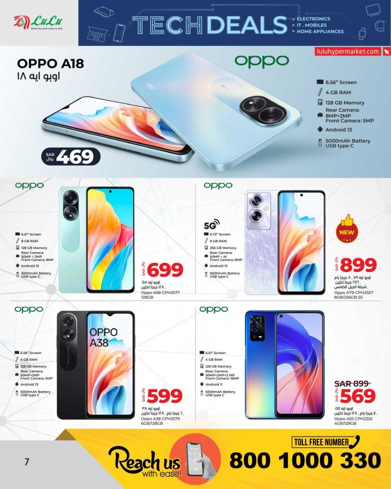 نواصل في لولو تقديم عروضنا الخاصة على أسعار الجوالات مثل هاتف أوبو A38 بسعة تخزين 128 جيجابايت و6 جيجابايت رام، وخصم مغري على جوال أوبو A55 بنفس سعة التخزين ورام 4 جيجابايت، بالإضافة إلى خصم حصري على جوال أوبو A79 بسعة تخزين 256 جيجابايت مدعوم بشبكة الجيل الخامس، وعرض خاص على جوال أوبو A18.