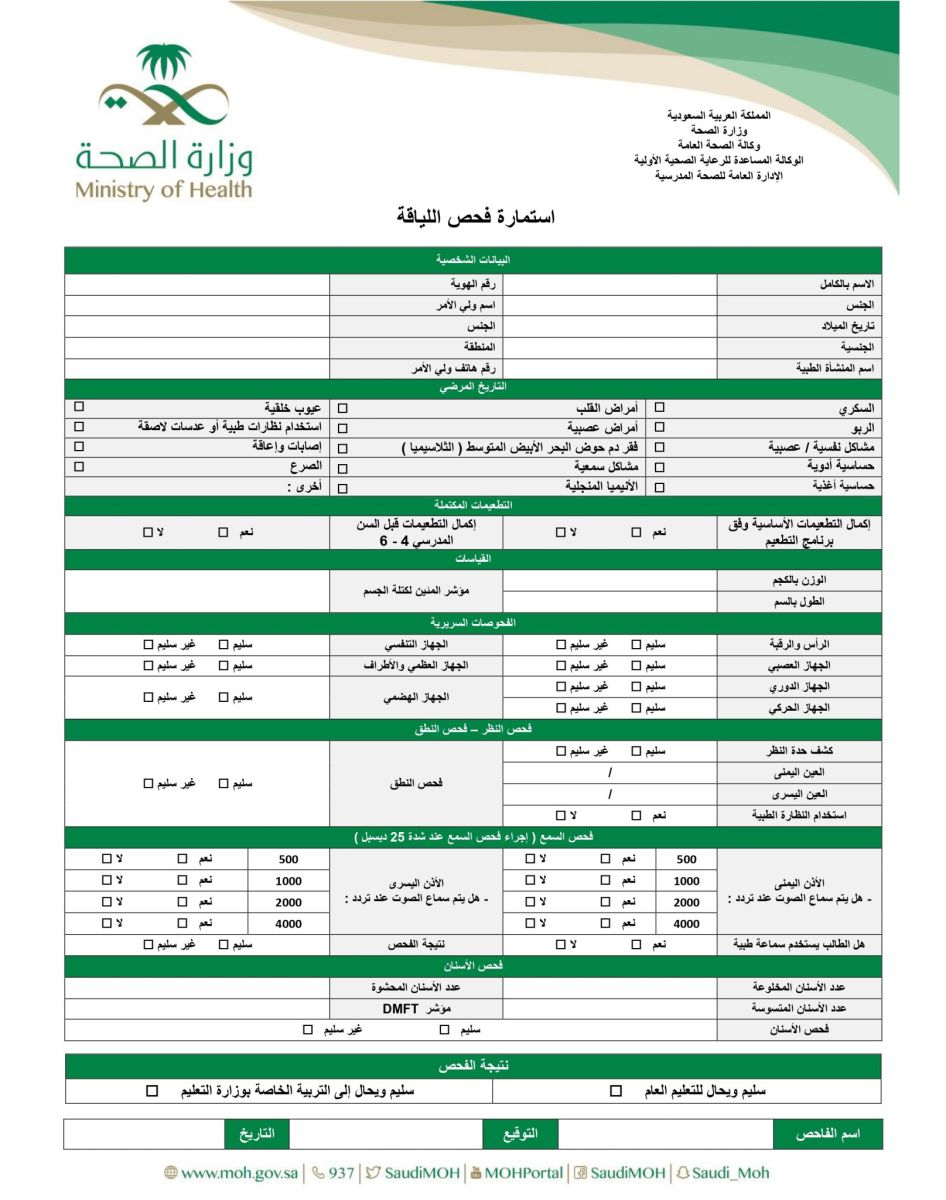 تعلن وزارة الصحة بالمملكة العربية السعودية عن توفير استمارة الفحص الطبي بصيغة PDF، والتي يطلب من أولياء الأمور إرفاقها عند تسجيل أبنائهم المستجدين في الصف الأول الابتدائي للعام الدراسي 1446هـ.