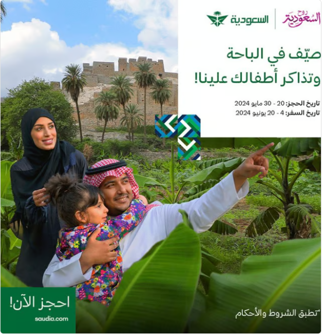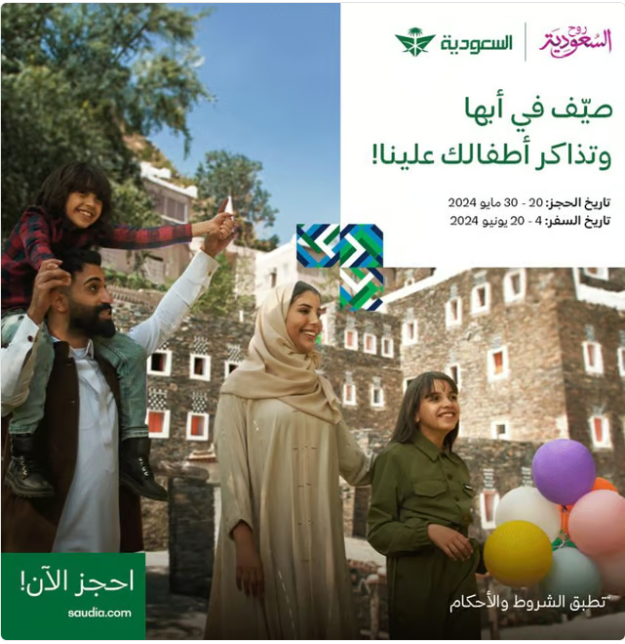 أعلنت شركة الطيران السعودية بالتعاون مع منصة "روح السعودية" عن عروض سخية تحت شعار "اكتشف الصيف في المملكة ودعنا نأخذ على عاتقنا تذاكر أطفالك"، بهدف تشجيع السياحة الداخلية بمناسبة اقتراب موسم الإجازات وإطلاق برنامج صيف السعودية 2024.
