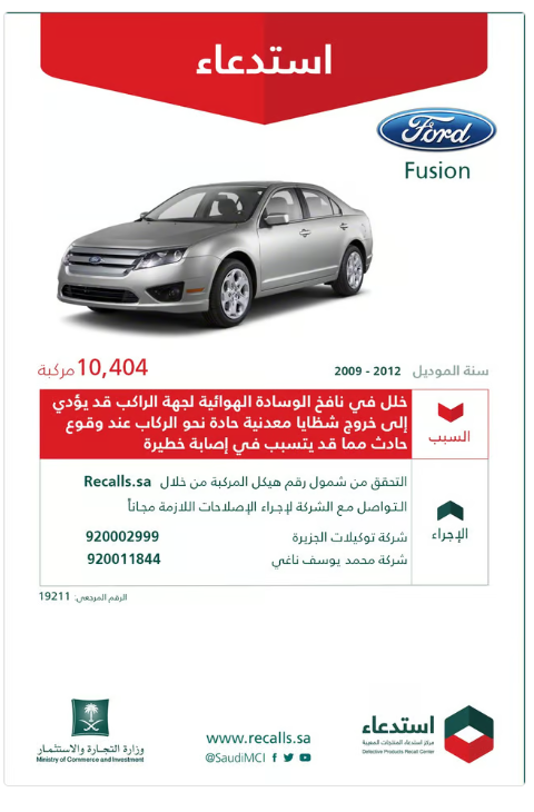 أعلنت وزارة التجارة عن توسيع نطاق حملة استدعاء تشمل 17,602 مركبة تابعة لعلامات السيارات الشهيرة "فورد"، "لينكون"، و"ميركوري"، تأتي هذه الخطوة في إطار حرص الوزارة على ضمان سلامة المواطنين والحفاظ على معايير الأمان في المركبات المتداولة في السوق.