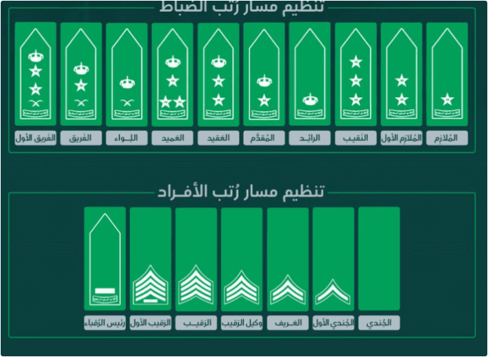 وفي هذا التقرير، سنستعرض تسلسل الرتب العسكرية في القوات المسلحة السعودية من الأقل إلى الأعلى، بالإضافة إلى سلم رواتب العسكريين والضباط، مع تحديد أعلى رتبة في العسكرية السعودية.